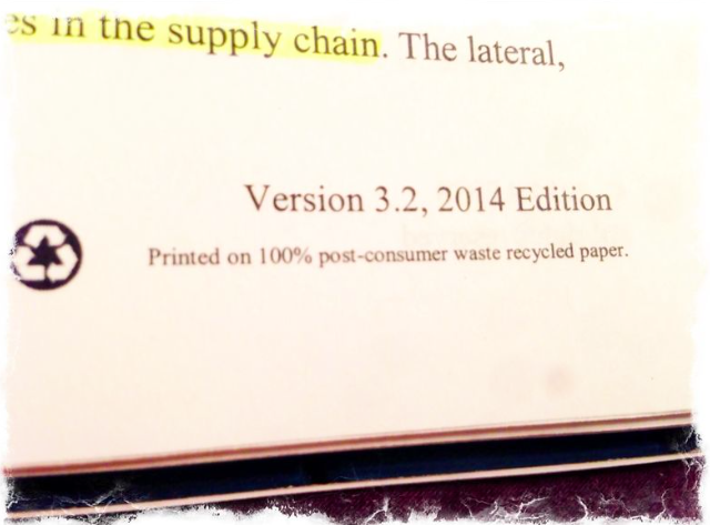 On a final note… back in class I was trying to convey the importance of letting people know your company takes green initiatives… when I got home I realized the small print at the bottom of our books: